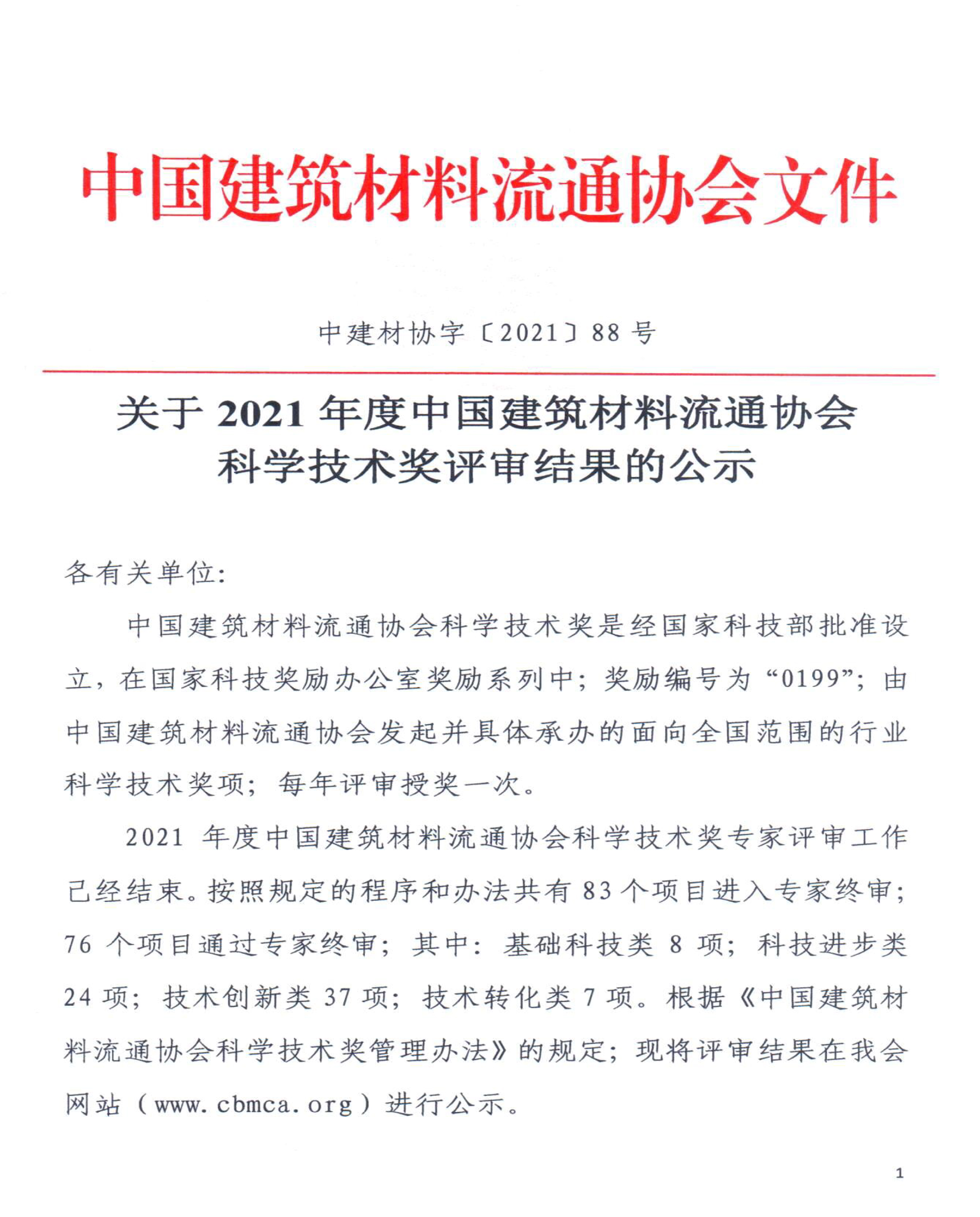 經國家科學技術獎勵工作辦公室審定批準,中國建筑材料流通協會作為承辦機構及責任主體并被授予終身編號0199號,在全國范圍內組織開展了2021年度科學技術獎的評選工作。最終評出獲獎項目共76項,其中基礎科技類8項,科技進步類24項,技術創新類35項,技術轉化類9項。