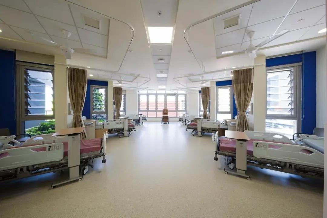根據(jù)醫(yī)院建筑面積特點和業(yè)務(wù)需求,不建議設(shè)置超過3床的開間病房,這會影響院感和患者舒適度。同時,根據(jù)規(guī)范規(guī)定的病房床間距不小于0.8米(筆者建議不小于1米)和通道不小于1.1米(筆者建議不小于1.2米)的要求,建議病房面積不小于35平方米,其中衛(wèi)生間設(shè)置不低于5平方米。以長方形房間建設(shè)為宜,開間長不低于8米,寬不低于4米,衛(wèi)生間可設(shè)計為正方形或長方形,原則上單邊不小于2米,且包含管井。每房一窗,朝向建議以西南方向為主,避免正西和正北。若條件允許,可參考新加坡黃廷芳醫(yī)院一人一窗的模式,讓每一名患者都能享受到陽光。